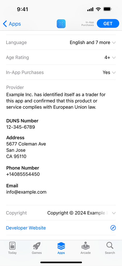 Articles 30 and 31 of the Digital Services Act (DSA) require Apple to verify and display trader contact information for all traders distributing apps on the App Store in the European Union (EU). This includes an address, phone number, and email address that you provide to Apple for the purpose of posting on your App Store product page in accordance with the DSA. Once verified, Apple will publish this information on your App Store product page when your app is distributed in any of the 27 territories of the EU. Even if you don’t distribute apps in the EU, you’ll still need to declare a trader status.